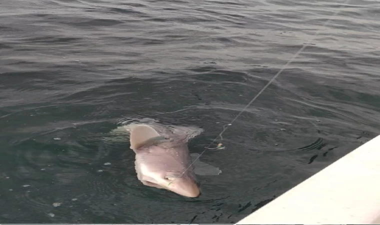 Oltalarına takılan köpek balığını karaya çıkartmadan denize bıraktılar
