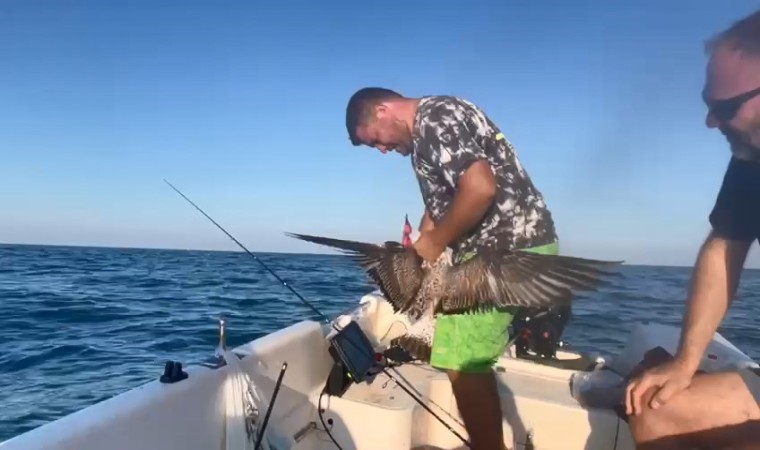 Samsun’da hobi balıkçılığı yapan üç kişi balık tutmak için tekneleriyle Karadeniz’e açıldı. Denize olta atan balıkçının oltasının ucundaki balığı kapmak isteyen martı kancaya takıldı. Balıkçı martıyı yaklaşık 15 metre çekerek tekneye getirdi. Kendi elleri ile kancayı çıkartan balıkçı, martıyı özgürlüğüne kavuşturdu. O anlar ise cep telefonu kamerası ile anbean kaydedildi.