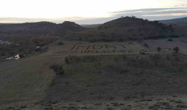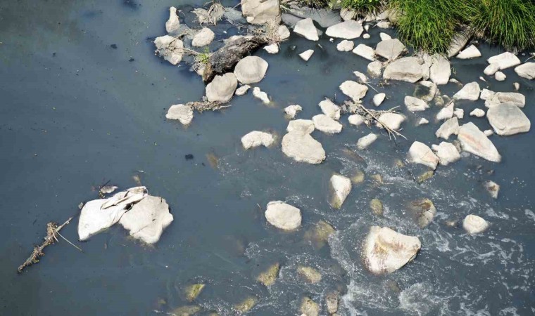 Gerede Çayı’ndaki kirliliğe tepki gösteren bir vatandaş kirli akan dere kenarındaki tarlasına traktörüyle “İmdat zehirleniyoruz” yazdı.