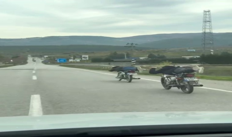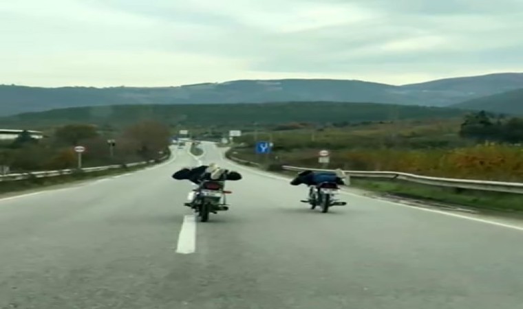Sakarya’nın Geyve ilçesi D-150 kara yolunda motosikletlerin üzerine yatarak giden iki sürücünün tehlikeli yolculuğu cep telefonu kamerasıyla kaydedildi.