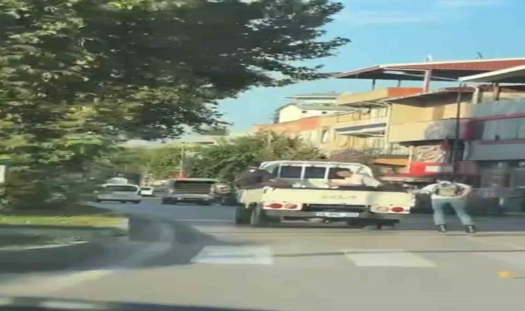 Bursa’da kırmızı ışıkta duran kamyonetin kasasına tutunan bir kişi, akan trafikte paten kayarak yolculuk yaptı. Canlarını tehlikeye atan genç kameraya yansırken, kamyonetin kasasında ise oturan iki kişi dikkat çekti.