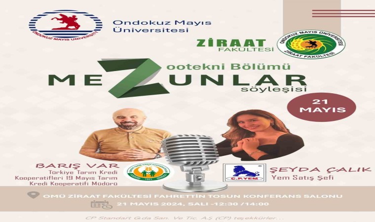 OMÜ Ziraat Fakültesi Zootekni Bölümü 2023-2024 mezuniyet söyleşisi yapıldı. Ziraat Fakültesi Fahrettin Tosun Konferans Salonu’nda düzenlenen söyleşide konuşan OMÜ Ziraat Fakültesi Zootekni Bölümü Öğretim Görevlisi Elif Cilavdaroğlu bölüm hakkında bilgi verdi. Programda ayrıca 2018 yılında lisans 2021 yılında yüksek lisanstan mezun olan Türkiye Tarım Kredi Kooperatifleri 19 Mayıs Tarım Kredi Kooperatifi Müdürü Ziraat Mühendisi Barış Var ve Özel bir firmada Yem Satış Şefi olarak çalışan Yüksek Ziraat Mühendisi Şeyda Çalış söyleyişi yaptı.