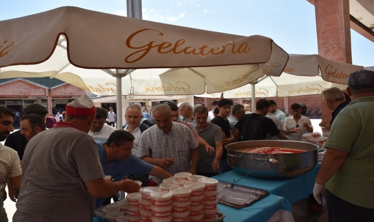 Yoğun katılımın olduğu aşure etkinliğinde, üzerinde Türk bayrağı motifi bulunan aşure kazanı ilgi gördü.
