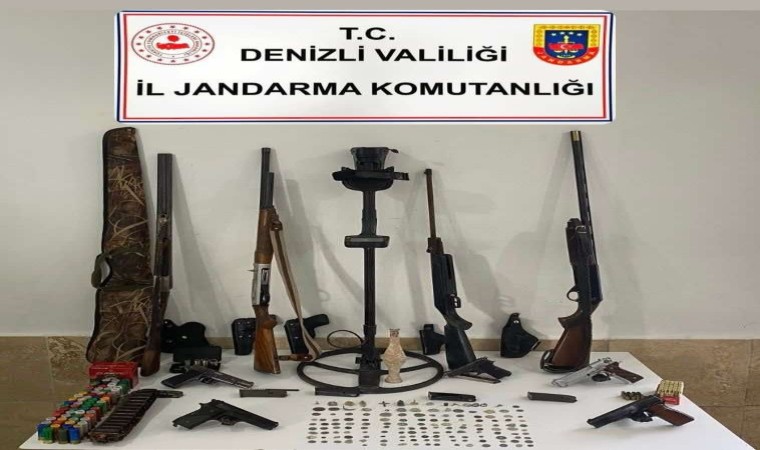 Denizli’de jandarma ekiplerinin operasyon düzenlediği adreste çok sayıda silah ve tarihi obje ele geçirildi.