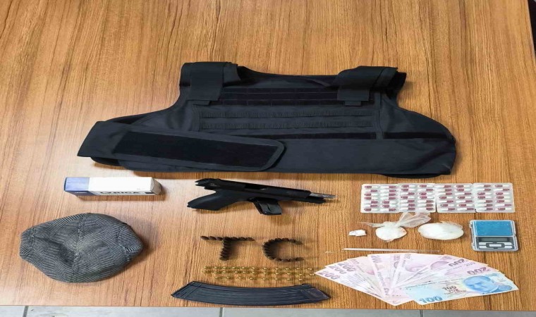 Mehmet B.’nin ikamet ettiği evde arama gerçekleştiren polis ekipleri, 1 ruhsatsız tabanca, 1 şarjör, 30 mermi, 1 AK-47 şarjörü, 29 fişek, 56 uyuşturucu hap, 55,5 gram uyuşturucu madde ile çelik yelek ele geçirdi.