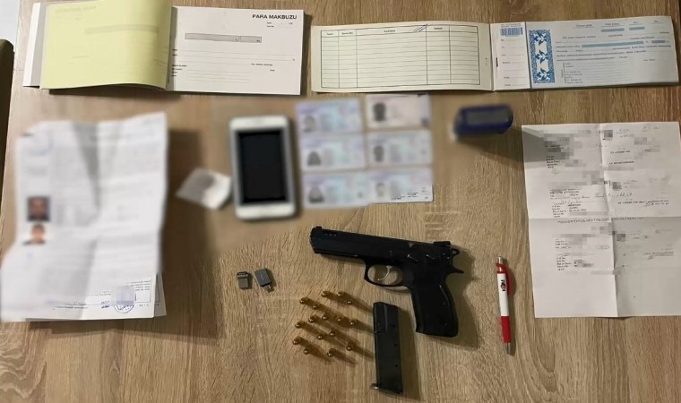 Şüphelilerin adreslerinde yapılan aramalarda; 105 adet farklı firmalara ait kaşe, 3 adet imza kaşesi, 25 adet çek sureti, 12 adet senet, çok sayıda paravan şirketlere ait fatura ve doküman, 2 adet 9 milimetre tabanca, 3 adet kurusıkı tabanca, 62 adet fişek ele geçirildi.