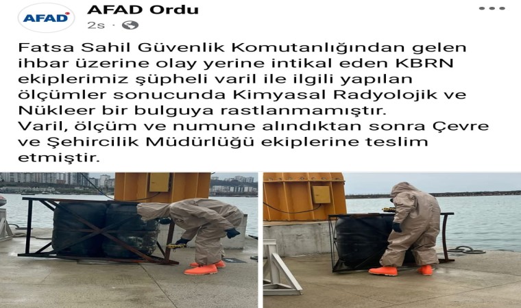 AFAD Ordu İl Müdürlüğü’nün resmi sosyal medya hesaplarından yapılan paylaşımda, “Fatsa Sahil Güvenlik Komutanlığı’ndan gelen ihbar üzerine olay yerine intikal eden KBRN ekiplerimiz şüpheli varil ile ilgili yapılan ölçümler sonucunda kimyasal, radyolojik ve nükleer bir bulguya rastlanmamıştır. Varil, ölçüm ve numune alındıktan sonra Çevre ve Şehircilik Müdürlüğü ekiplerine teslim edilmiştir” denildi.