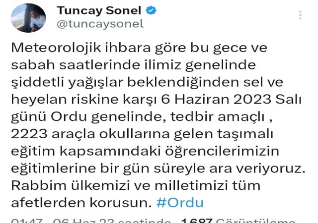Ordu Valisi Tuncay Sonel, Karadeniz Bölgesi'nde yaşanan sel ve heyelan riskine karşı tedbir alınması amacıyla taşımalı sistemle okula gelen öğrencilerin eğitimine bir gün ara verildiğini duyurdu. Vali Sonel, sosyal medya hesabından yaptığı açıklamada, "Meteorolojik ihbara göre bu gece ve sabah saatlerinde ilimiz genelinde şiddetli yağışlar beklendiğinden sel ve heyelan riskine karşı 6 Haziran 2023 Salı günü Ordu genelinde tedbir amaçlı, 2 bin 223 araçla okullarına gelen taşımalı eğitim kapsamındaki öğrencilerimizin eğitimlerine bir gün süreyle ara veriyoruz. Rabbim ülkemizi ve milletimizi tüm afetlerden korusun" dedi.