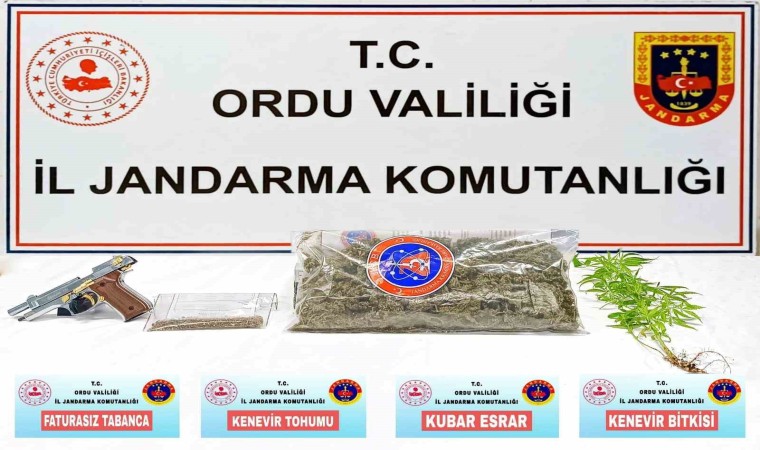 İl Jandarma Komutanlığı ekipleri tarafından uyuşturucu imal ve ticareti ile mücadeleye yönelik yapılan çalışmalar sonucu Fatsa İlçesinde düzenlenen operasyonda 1 kilo 32 gr kubar esrar, 102 gr kenevir tohumu, 2 kök kenevir, 1 adet kurusıkı tabanca ve 2 adet tabanca şarjörü ele geçirildi. Olayla ilgili yakalanan 1 şüpheli, karakoldaki işlemlerinin ardından adli mercilere sevk edildi. Uyuşturucu ile mücadelenin devam edeceği bildirildi.