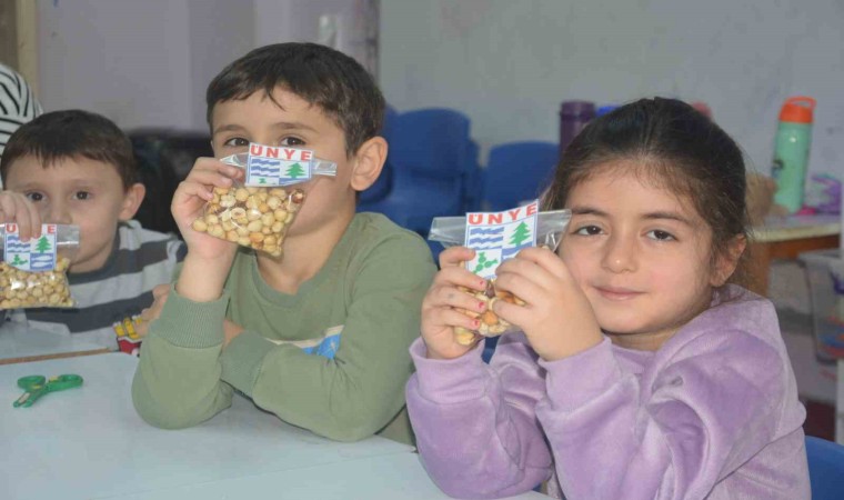 Kardeş okul olan Antalya’nın Kepez ilçesinde öğrencilere Ünye’nin meşhur fındığını gönderdiklerini ifade eden Meçhul Asker Ortaokulu Baykuşlar Anasınıfı Öğretmeni Tuğba Cinek, “Bizler her sene yeni yıla girerken böyle bir ’Kardeş Okul Kart Etkinliği’ düzenliyoruz. Bu projemiz çocuklarımız açısından da çok faydalı oluyor. Milli Eğitim Bakanlığı tarafından yeni uygulanan Maarif programa uygun olarak tüm Türkiye’deki okul öncesi öğretmenlerle iletişimde olmak amacıyla böyle bir etkinliğimizi gerçekleştirdik. Öncelikle sosyal medyadan bir okulla eşleşiyoruz ve eşleşen bu okullar birbirlerine yılbaşı kartları hazırlayarak ufak hediyeler gönderiyorlar. Biz de bu projeyle Antalya’nın Kepez ilçesinde bulunan bir okulla eşleştik. Daha sonra çocuklarımız kendi emekleriyle birer yılbaşı kartı hazırladılar. Yine velilerimiz bölgemizin ekonomideki en önemli yeri olan fındığı Antalya’ya göndermek için bizlere ulaştırdılar. Biz de çocuklarla beraber bunları poşetledik” dedi.