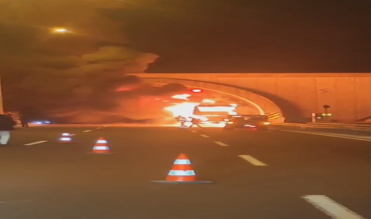 Kocaeli’den İzmir istikametine giden yolcu otobüsü, Bursa-İstanbul yolu Orhangazi Tüneli girişinde alev alev yandı. 35 yolcu hızla tahliye edilirken, 2 yolcu dumandan etkilendi.