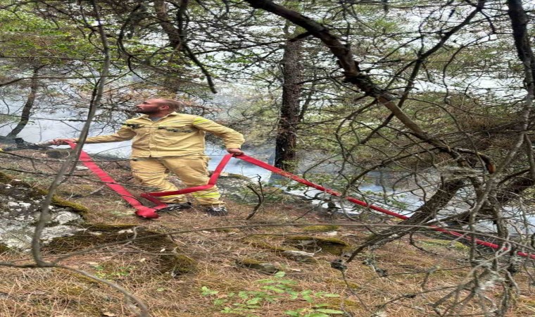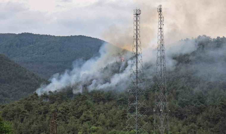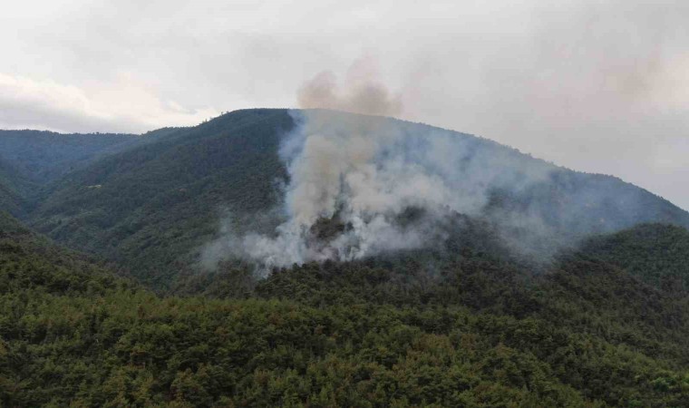 Karabük’te yıldırım düşmesi nedeniyle sarp alanda çıkan orman yangınına karadan söndürme çalışmaları sürüyor.
