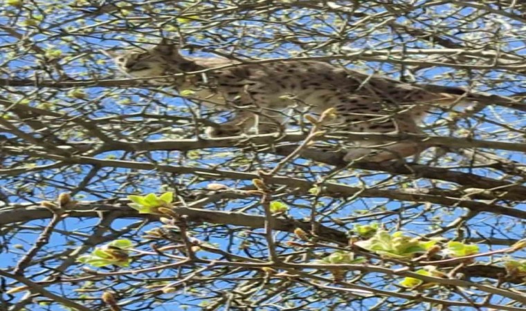 Sivas’ın Hafik ilçesinde, ormanın hayaleti olarak adlandırılan bir vaşak, köpeklerin saldırısından korunmak için tırmandığı ağaca sığındı