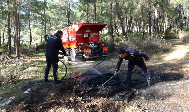Yangını ihbar eden vatandaşların, bir kişinin el arabasıyla lastikleri getirip ateşe verdiğini söylemesi üzerine jandarma ekipleri lastikleri getiren ve yakan kişinin belirlenerek yakalanması için çalışma başlattı.