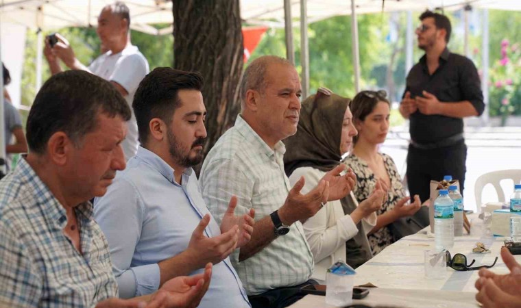 Aşure etkinliğinde dua okunurken, MHP İl Başkanı Oğuz Akarfırat ve Ortaca Belediye Başkanı Alim Uzundemir vatandaşlara aşure dağıtımı gerçekleştirdi.