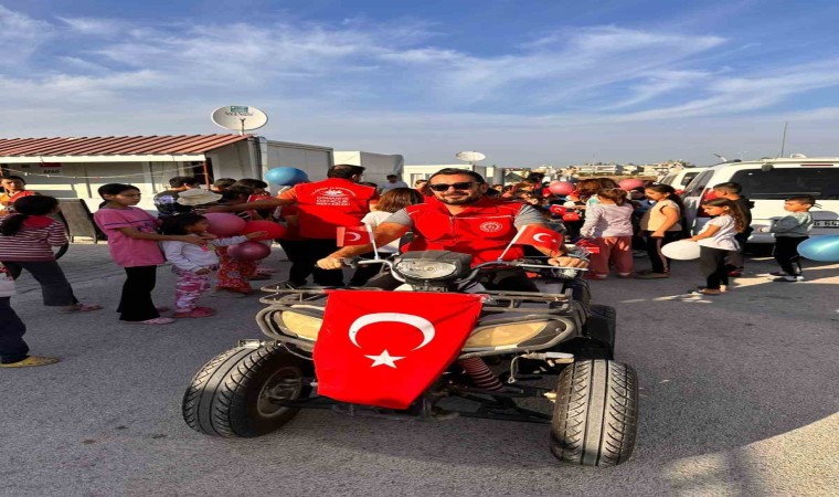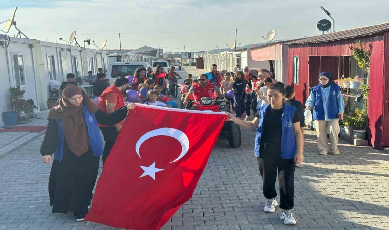 Osmaniye’de konteyner kentte yaşayan depremzede çocuklar 29 Ekim Cumhuriyet Bayramı coşkusunu bayraklarla süslenmiş tırtıl araçla tur atarak yaşadı.