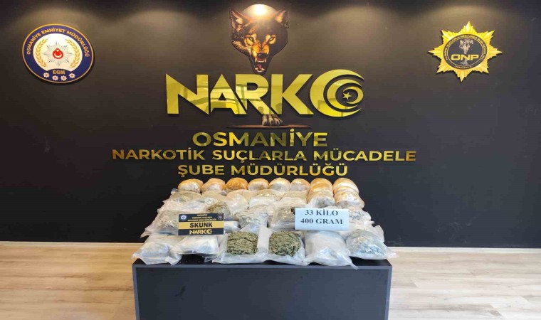 Osmaniye’de durdurulan otomobilde yapılan aramada 33 kilo 400 gram skunk maddesi ele geçirildi. Gözaltına alınan 2 kişi tutuklandı.