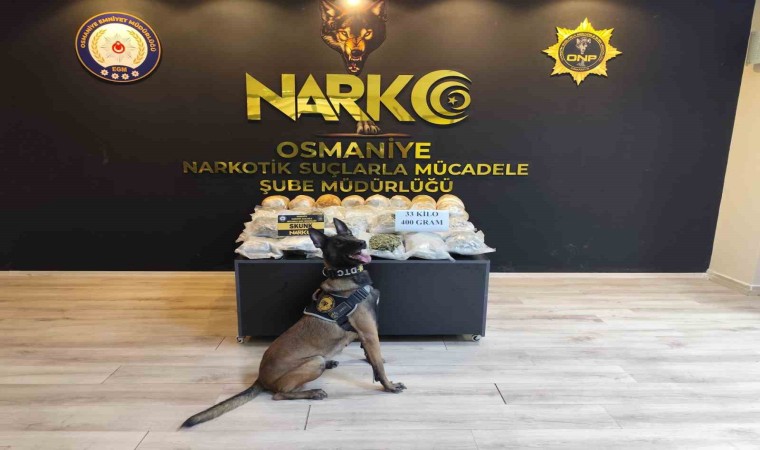 Osmaniye Emniyet Müdürlüğü ekipleri, uyuşturucuyla mücadele çalışmaları çerçevesinde şüphe üzerine bir otomobili durdurdu. Ekiplerin, hassas burunlu narkotik köpeği ile otomobilde yaptığı aramada bagaj kısmında bulunan çuval ve valizin içine saklanmış 33 kilo 400 gram skunk maddesi ele geçirildi.