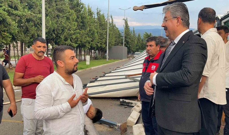 Osmaniye’de öğleden sonra etkili olan fırtına, beraberinde yağmuru da getirdi. Yağışla birlikte yollar göle dönerken, fırtına iş yerlerinin çatısını uçurdu, ağaçları kökünden söktü. Adnan Menderes Mahallesi’nde depremzede esnaf için yapılan Cebelibereket konteyner çarşıda bulunan dükkanlar fırtınada zarar gördü. Osmaniye Valisi Erdinç Yılmaz, konteyner çarşıyı ziyaret ederek, çalışmalar hakkında bilgi aldı. Ziyaretinin ardından açıklama yapan Vali Yılmaz, "Osmaniye’mizde maalesef çok güçlü bir fırtına ve yağmur çatıların uçmasına, ağaçların devrilmesine, konteyner çarşımızın birçok çatısının uçmasına vesile oldu. Ama biz buradayız, vatandaşlarımızın yandayız. Hamdolsun şu ana kadar herhangi bir can kaybı, bir olumsuzluğumuz yok. Bizim için bu önemli. Bunların hepsini Allah’ın izniyle en kısa sürede yerine getiririz" diye konuştu.