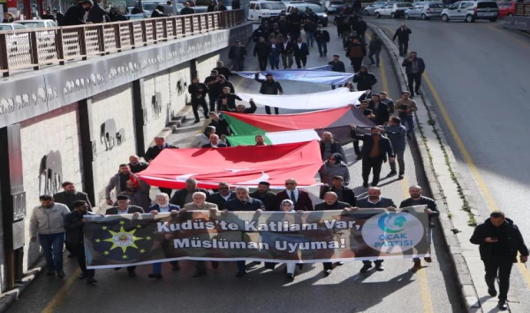 Turgay İPEK / ERZURUM, (DHA) - Osmanlı Ocakları Gençlik Kolları Başkanlığı tarafından Cuma namazı sonrası Erzurum'un Yakutiye ilçesinde düzenlenen yürüyüşe çok sayıda vatandaş ve partili katıldı. Saray Bosna Caddesinden yaklaşık 3 kilometre uzaklıktaki İstasyon Caddesine kadar Filistin-Kudüs-Doğu Türkistan zulmüne dur demek için yürüyen kalabalık, "Hamasa selam direnişe devam", "Ya Allah bismillah Allahekber". "Kahrolsun İsrail" sloganları attı.