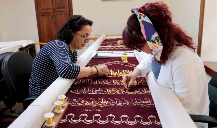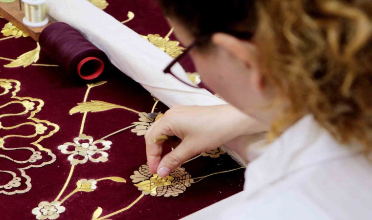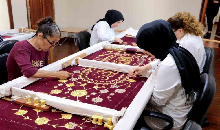 Adana Olgunlaşma Enstitüsü’nde usta öğreticiler, Osmanlılarda mezar sandukalarının üzerine örtülen örtü olarak bilinen puşideleri, Maraş işi tekniğiyle ilmek ilmek işliyor.