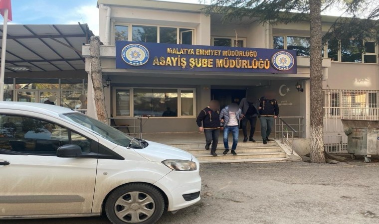 Malatya, kent merkezinde son bir hafta içerisinde meydana gelen 10 ayrı araçtaki hırsızlık olayları ile bir adet motosikletin çalınması olaylarıyla ilgili çalışma başlatan Asayiş Şube Müdürlüğü Oto Hırsızlığı Büro Amirliği ekipleri izlenen 220 saatlik kamera görüntüleri sonrası kimlikleri belirlenen U.Ö., V.Y. ile M.C.’yi yakalayarak gözaltına aldı. Zanlıların ikametinde arama yapan ekipler 9 adet akü, 1 adet oto teyp, 2 adet motosiklet, 2,5 gram uyuşturucu madde ile bir adet şasesi silinmiş motosiklet ele geçirdi.