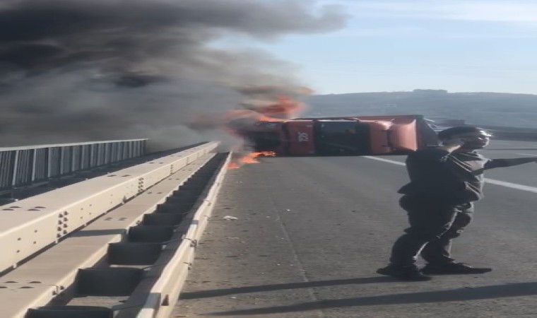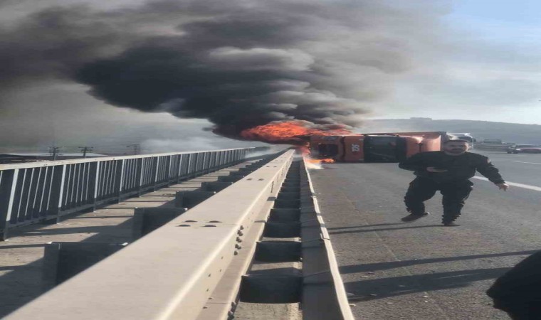 Bursa-İstanbul otoyolu Gemlik-Dürdane Mevkisi’nde kaza yapan tır yan yatarak alev alev yandı. Tırda zaman zaman yaşanan patlamalar korku dolu anlar yaşattı. Şoförün yanan ve patlayan araçtan kurtulma anları da saniye saniye kameraya yansıdı.