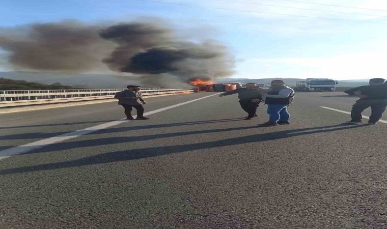 Tırda zaman zaman patlama yaşandı. Trafik ise tek şeritten akarken, yoldan geçen diğer sürücüler ve yolcular olayı korku dolu gözlerle izlediler