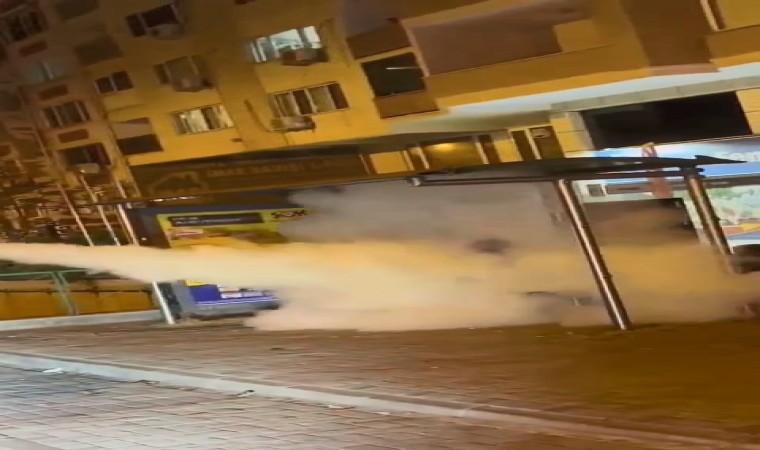 Bursa’da açık kasa kamyonetle gelen bir grup genç, otobüs durağında bekleyen kişinin üzerine yangın söndürme tüpü püskürterek hızla kaçtı. O anlar kameraya anbean yansıdı.