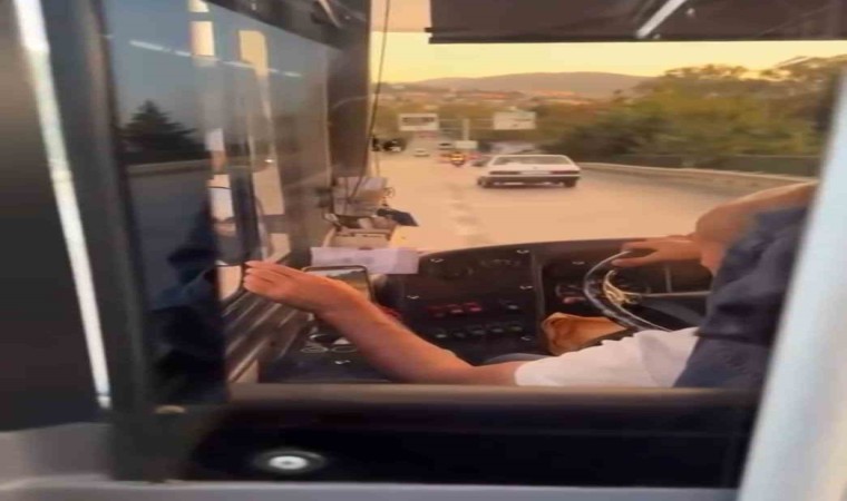 Bursa’da özel halk otobüsünde direksiyon başında cep telefonundan video izleyen sürücünün o anları yolcuların kamerası tarafından kaydedildi. Kazaya davetiye çıkaran sürücünün rahat hareketleri ise dikkat çekti.