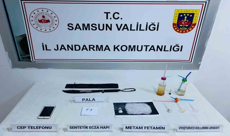 A.Y.U.’nun üzerinde ve evinde yapılan aramada, 102 gram metamfetamin, 2 adet sentetik ecza hap, 6 adet uyuşturucu kullanma aparatı ve 1 adet pala ele geçirildi.