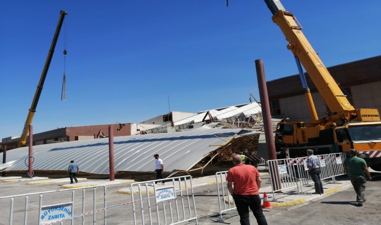 Malatya’da depremlerde hasar alan Şehirler Arası Otobüs Terminali’nde (MAŞTİ) çalışma yapan vinçle çatı malzemesi taşınırken halatı koptu. Yürekleri ağza getiren kazada yaralanan olmadı.