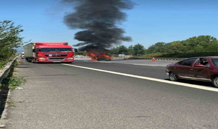 Olay, Anadolu Otoyolu Gölyaka gişeler mevkisinde meydana geldi. Edinilen bilgiye göre, Sakarya’dan Bolu istikametine giden K.G. idaresindeki 41 AHE 229 plakalı Honda marka otomobilden dumanlar çıkmaya başladı. Panik olan sürücü araçtan indi. Bir süre sonra otomobil adeta alev topuna döndü. Bölgede yol yapım faaliyeti yürüten Karayolları ekipleri yolu trafiğe kapattı. İhbar üzerine olay yerine gelen itfaiye ekipler ise alev topuna dönen otomobili söndürdü. Yangın sebebiyle otomobil kullanılamaz hale geldi. Trafik ise otomobilin yoldan kaldırılmasının ardından normal seyrine döndü.