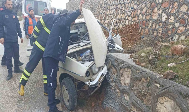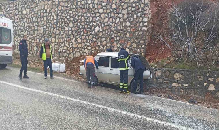 Adıyaman Çelikhan karayolu üzerinde sürücüsünün direksiyon hakimiyetini kaybettiği otomobil istinat duvarına çarptı.