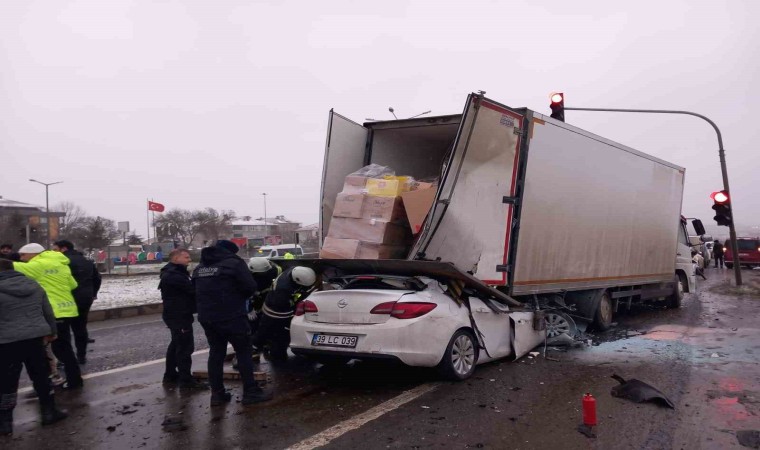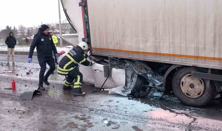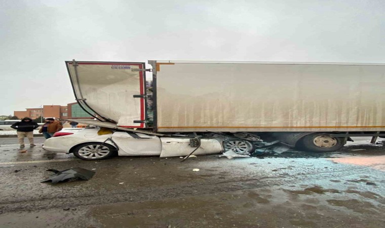 Tekirdağ’da meydana gelen zincirleme kazada otomobil kamyona ok gibi saplandı. Feci kazada 1 kişi hayatını kaybetti.