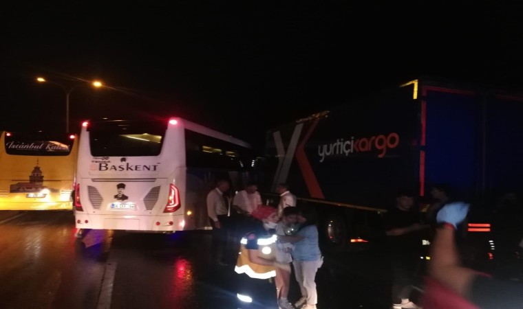 Yine aynı yönde seyreden M.Ş’nin kullandığı 06 DS 3559 plakalı kamyonda durmak isterken aracın kayması sonucu bariyere çarpıp daha sonra 06 EKK 194 plakalı yolcu otobüsüne çarptı. Kazada 6 kişi yaralandı. Kazanın ardından çevredekilerin haber vermesi ile olay yerine gelen ekipler yaralıları ambulanslarla hastanelere kaldırdı.