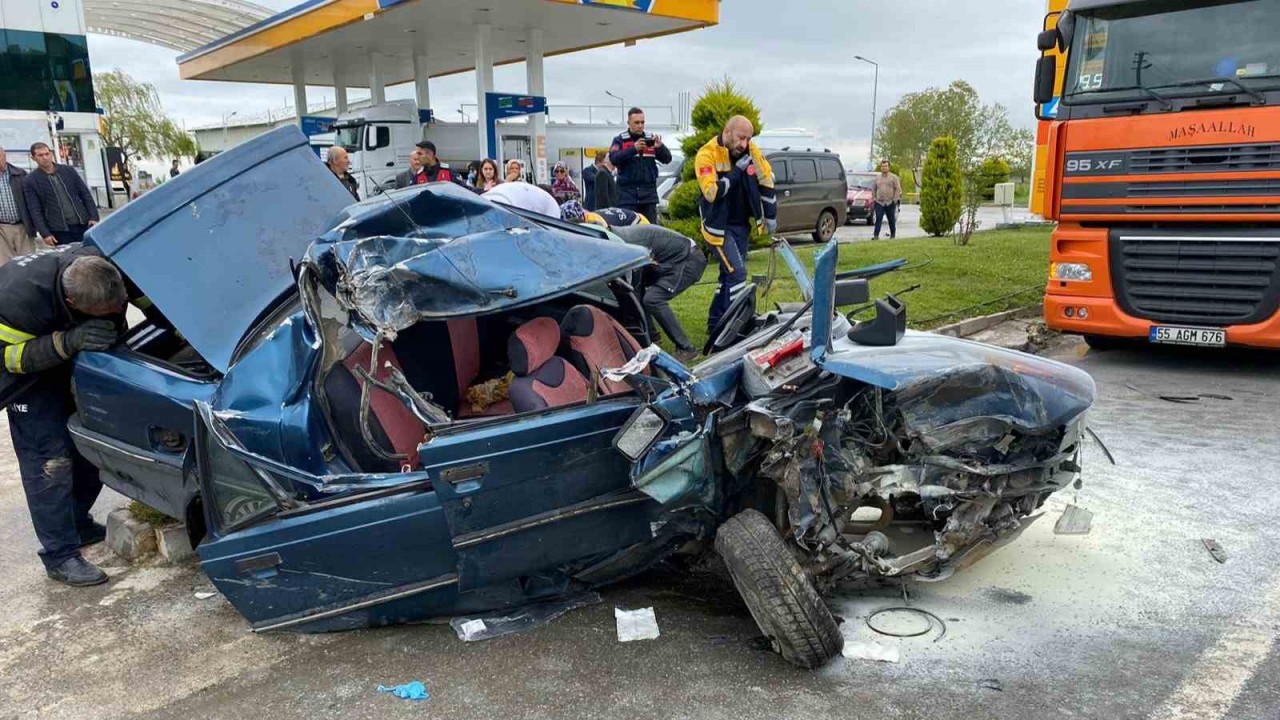 SAMSUN'UN ALAÇAM İLÇESİNDE PARK HALİNDEKİ TIRA ÇARPAN OTOMOBİL HURDAYA DÖNDÜ. KAZADA 3 KİŞİ YARALANDI.