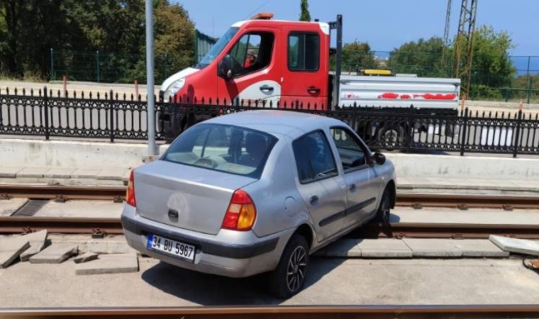 Samsun’da otomobilin yoldan çıkarak raylı sistem hattına girmesi yürekleri ağza getirdi.