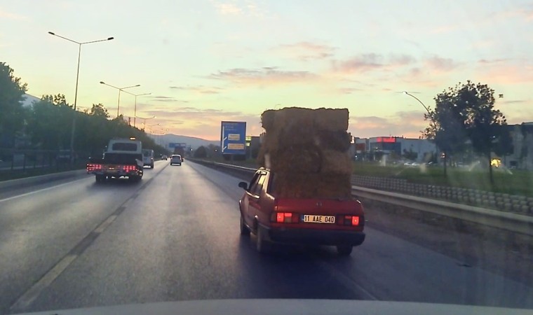 Bursa’nın İnegöl ilçesinde bir sürücü, aracının üzerinde saman balyaları taşıdı. O anlar amatör kameraya saniye saniye yansıdı.