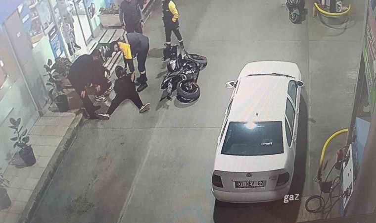 Akaryakıt istasyonunda otomobil sürücüsünün inmek için açtığı aracının kapısına çarpan motosiklet sürücüsü yaralandı. Kaza anları güvenlik kamerasına yansıdı.