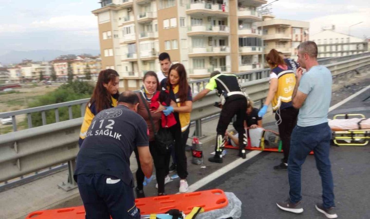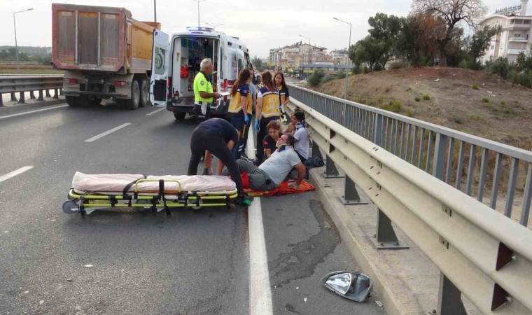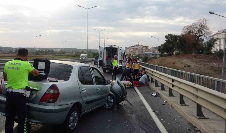 Antalya’nın Manavgat ilçesinde bariyerlere çarparak hurdaya dönen otomobilde bulunan 4 kişi yaralandı. Kazanın ardından otomobilden çıkarılan yaralılar aracın yol artasında olması ve yolun kapanması nedeniyle oturup ambulans bekledi.