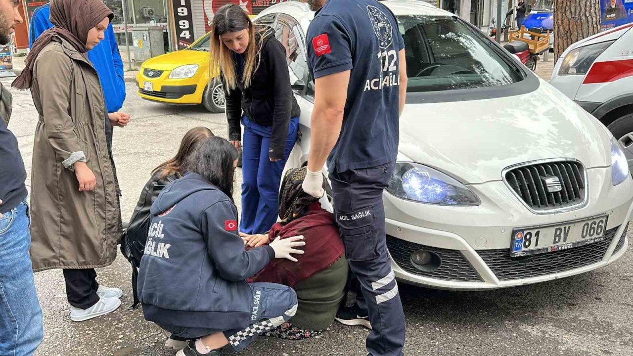 DÜZCE’DE YAYA GEÇİDİNDE KARŞIDAN KARŞIYA GEÇMEYE ÇALIŞAN YAŞLI KADINA OTOMOBİL ÇARPTI. KAZADA YARALANAN YAŞLI KADINA OLAY YERİNDEN GEÇEN HEMŞİRELER İLK MÜDAHALEYİ YAPTI.