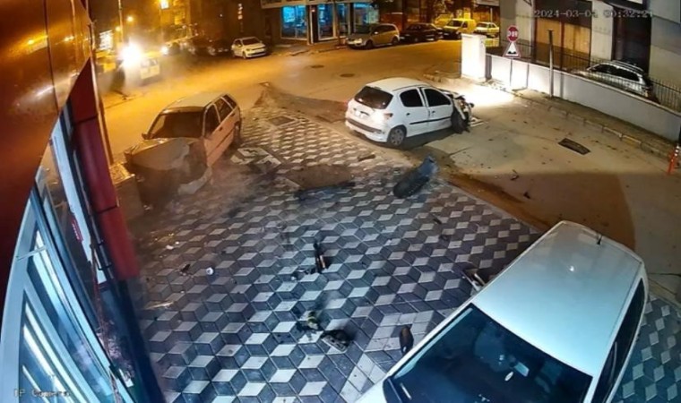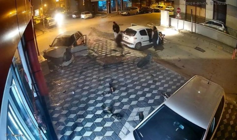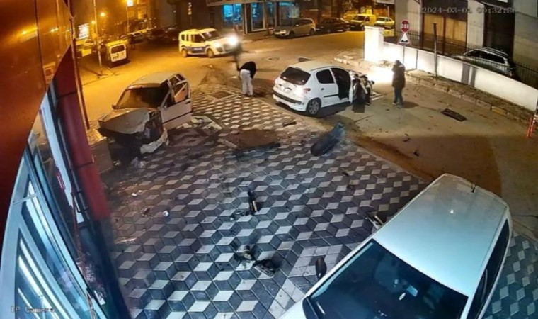 Görüntüde; çarpışmanın etkisiyle savrulan otomobillerden birinin önce çöp konteynerine ardından iş yerinin kapısına zarar verdiği anlar yer aldı. Devriye gezen polis ekiplerinin olay yerine yöneldiğini gören otomobil sürücüsünün kaçtığı ve polislerin peşine koştuğu anlar da güvenlik kamerasına yansıdı. Kaza sonrası diğer otomobil sürücü ve yanında bulunduğu bir yolcunun da birbirlerine sarıldığı görüldü.