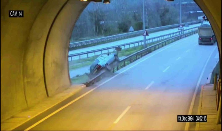 Amasya’da bir otomobilin tünel çıkışında bariyere çarparak takla attığı feci kaza, güvenlik kamerasına yansıdı.