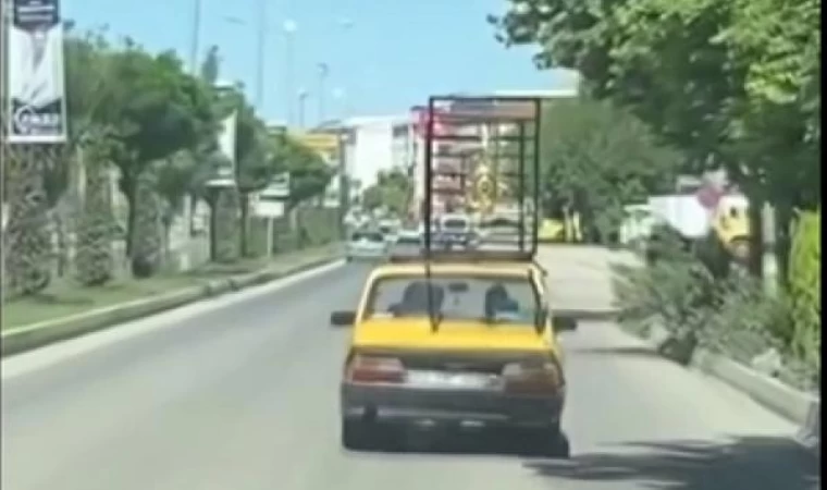 Cahit Dalokay Caddesi’nde sürücüler, kamyonetle taşınması gereken demir korkulukların, otomobilin üzerine bağlanarak ilerlediğini görünce şaşkınlık yaşadı. Tehlikeli yolculuk tepki çekerken, aynı istikamette ilerleyen diğer sürücüler ise o anları cep telefonu kamerasıyla kaydetti. (DHA)