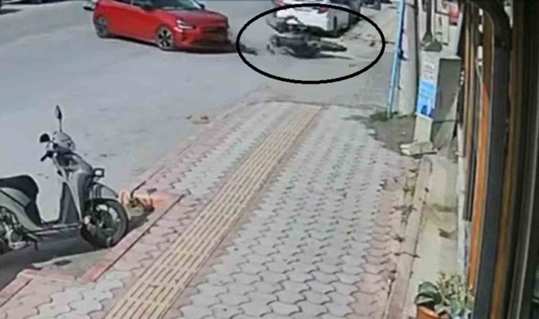 Hatay’ın Arsuz ilçesinde otomobil ile çarpışan motosiklet sürücüsünün kaza esnasında motordan uçtuğu anlar güvenlik kamerasına yansıdı.