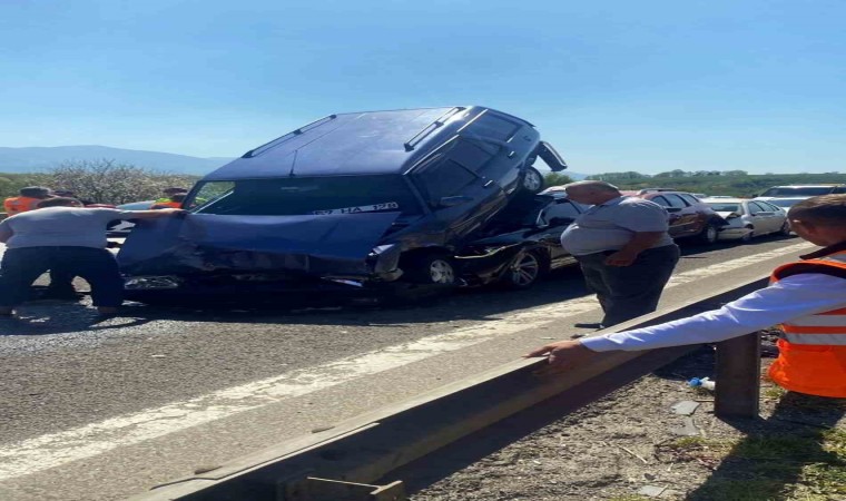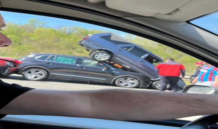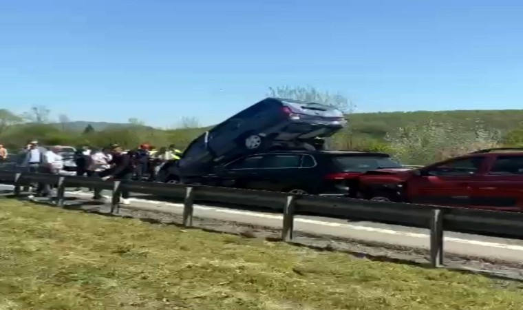 Bayram tatili sebebi ile yoğunluğun yaşandığı Anadolu Otoyolu Sakarya geçişinde meydana gelen 9 araçlı zincirleme trafik kazasında iki kişi yaralandı. İki aracın üst üste çıktığı kazayı görüp şaşkınlığını gizleyemeyenler dönüp bir daha baktı.