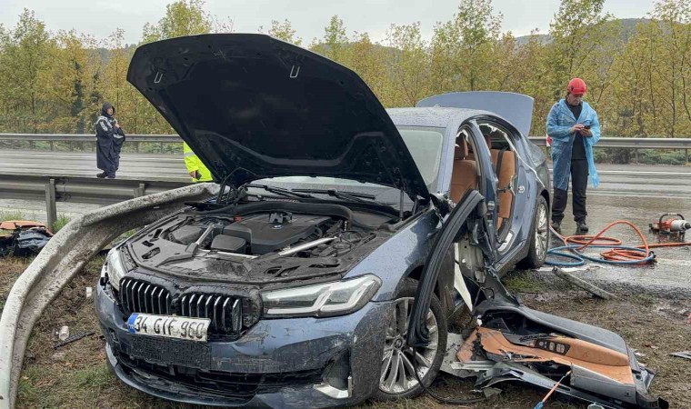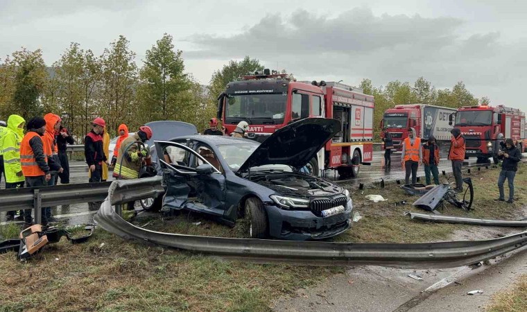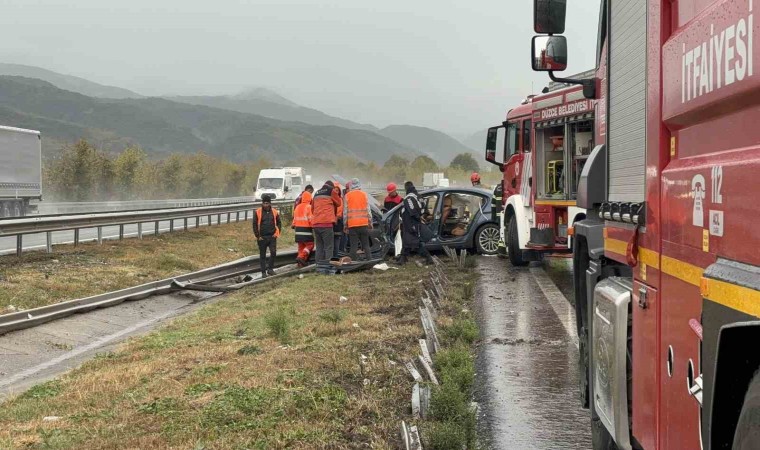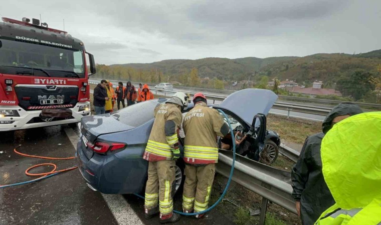Kaza, Anadolu Otoyolu’nun Bolu-Düzce sınırında Kaynaşlı ilçesi mevkisinde meydana geldi. Edinilen bilgiye göre, Ankara istikametinde seyreden İsmail Ö. idaresindeki 34 GIF 969 plakalı BMW marka otomobil, Bolu Dağı Tüneli’ne yaklaşık 5 kilometre kala kontrolden çıktı. Yağış sebebiyle kayganlaşan yolda sürücüsünün direksiyon hakimiyetini kaybettiği lüks otomobil bariyerlere çarptı. Çarpmanın etkisiyle araçta bulunan sürücü İsmail Ö. ve Sevilay Ö. aracın içinde sıkıştı. Kazayı gören vatandaşlar durumu 112 Acil Çağrı Merkezine bildirdi. İhbar üzerine olay yerine sağlık, itfaiye ve polis ekipleri sevk edildi. Kısa sürede olay yerine gelen itfaiye ekipleri, aracın içinde sıkışan yaralı sürücü İsmail Ö. ve Sevilay Ö.’yü sıkıştığı yerden kurtararak sağlık ekiplerine teslim etti. Yaralılar ambulansla Düzce’deki hastanelere kaldırdı.