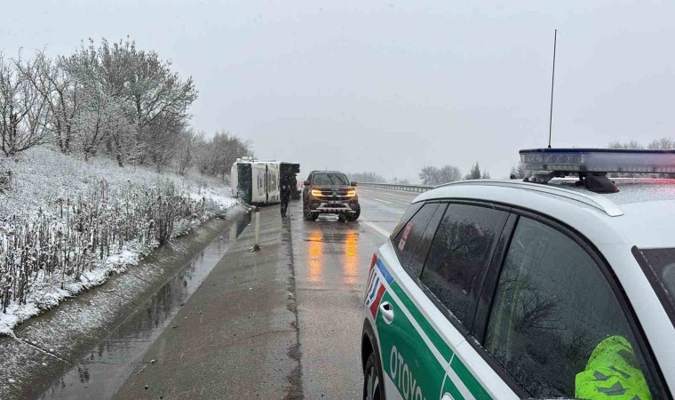 Edirne’den İstanbul istikametine giden tır, Babaeski mevkisinde kar yağışı sebebiyle yolun kaygan olmasından dolayı yoldan çıkarak devrildi. Kazada tır sürücüsü yaralandı.