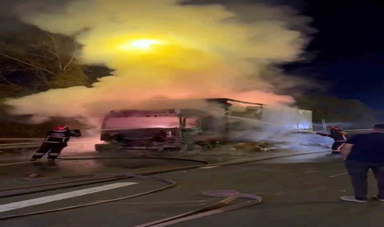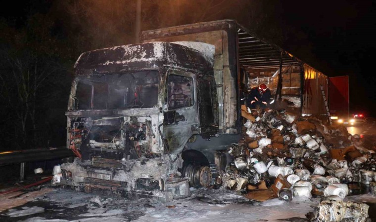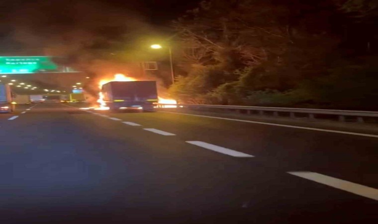 Anadolu Otoyolu Sakarya geçişinde elyaf iplik yüklü tırın alev topuna döndüğü ve itfaiye ekiplerinin yangına müdahale ettiği anlar cep telefonu kamerası ile saniye saniye kaydedildi.